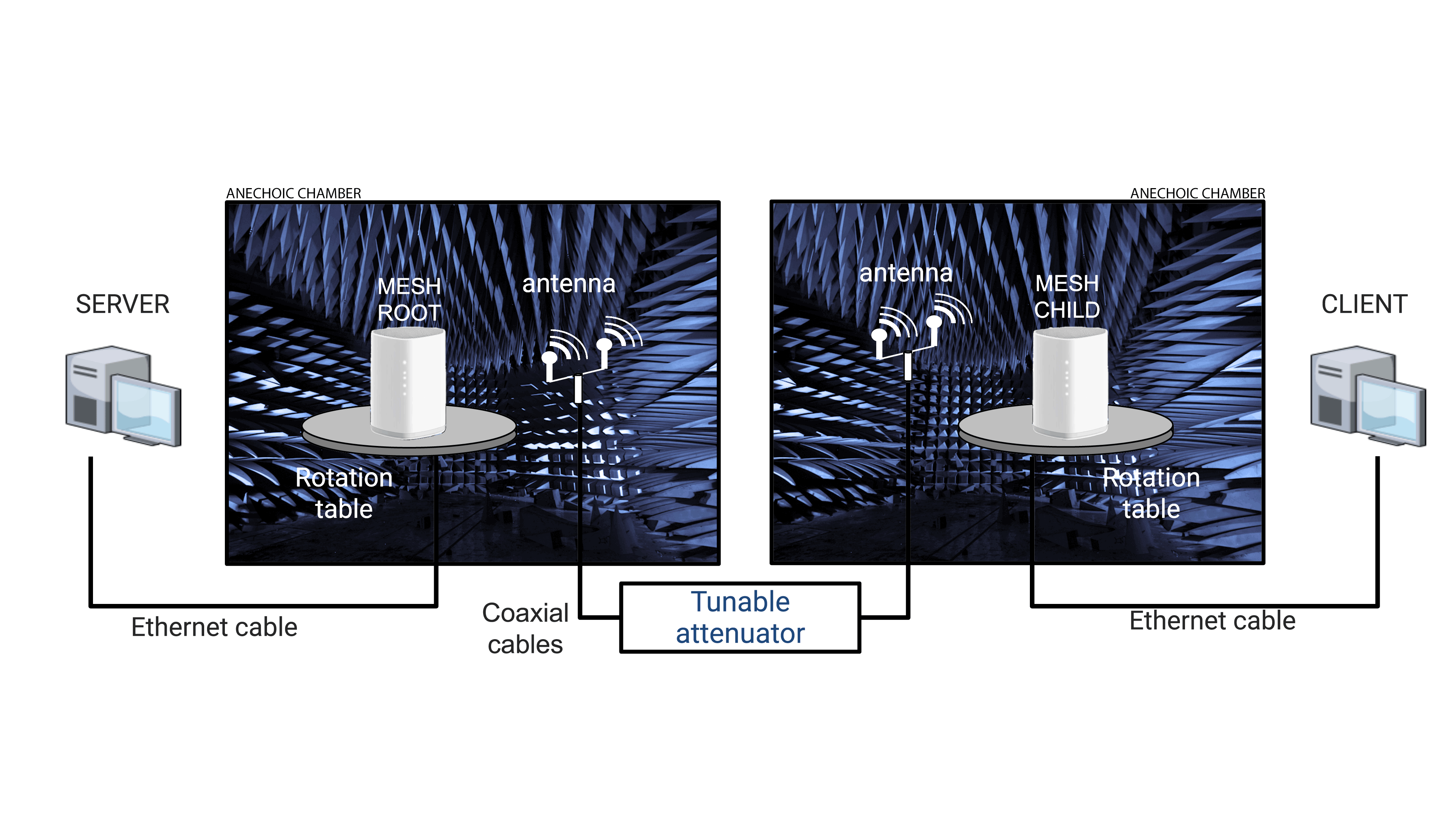Two shielded and anechoic boxes connected through variable attenuator to emulate distance between the mesh nodes